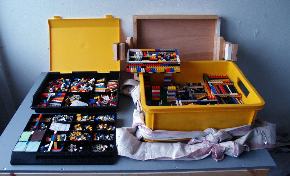 Special moulding system made from modified Lego bricks. The assembly process for each unique single-use mould was very time-consuming, and I was spending all of my spare time alone. Most of the time was taken in assembling the mould parts, so I developed the backpack as a mobile system, with space to store a few mould parts, so that I could take it to work at other people’s houses.